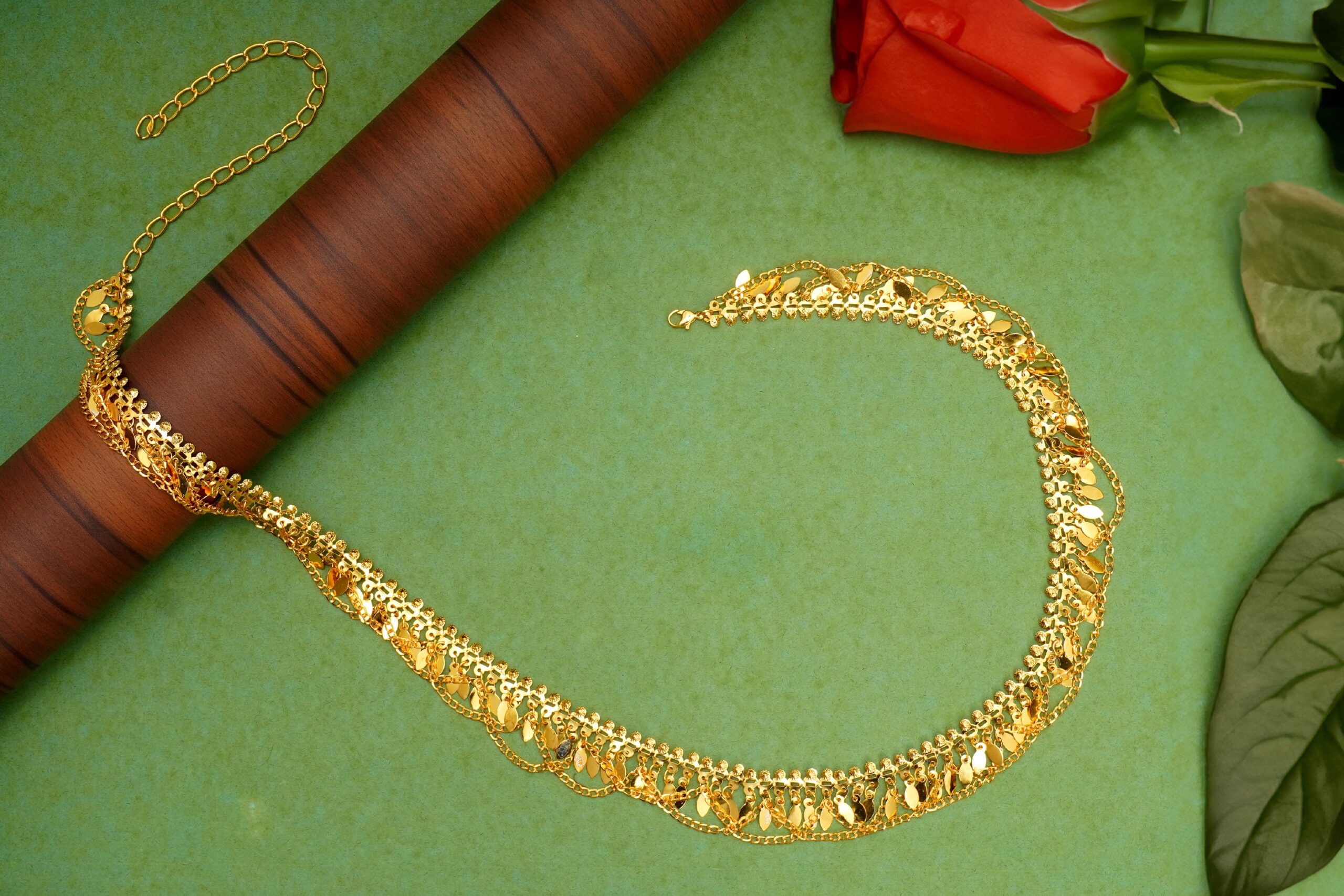 Known for its “pan” leaf-inspired designs that are firmly ingrained in Indian culture, a pan gold traditional full kamarbandh is a sophisticated and gorgeous waist adornment. This kamarbandh, which is frequently worn at formal events like weddings, festivals, or traditional ceremonies, is the ideal fusion of traditional design and classic beauty.