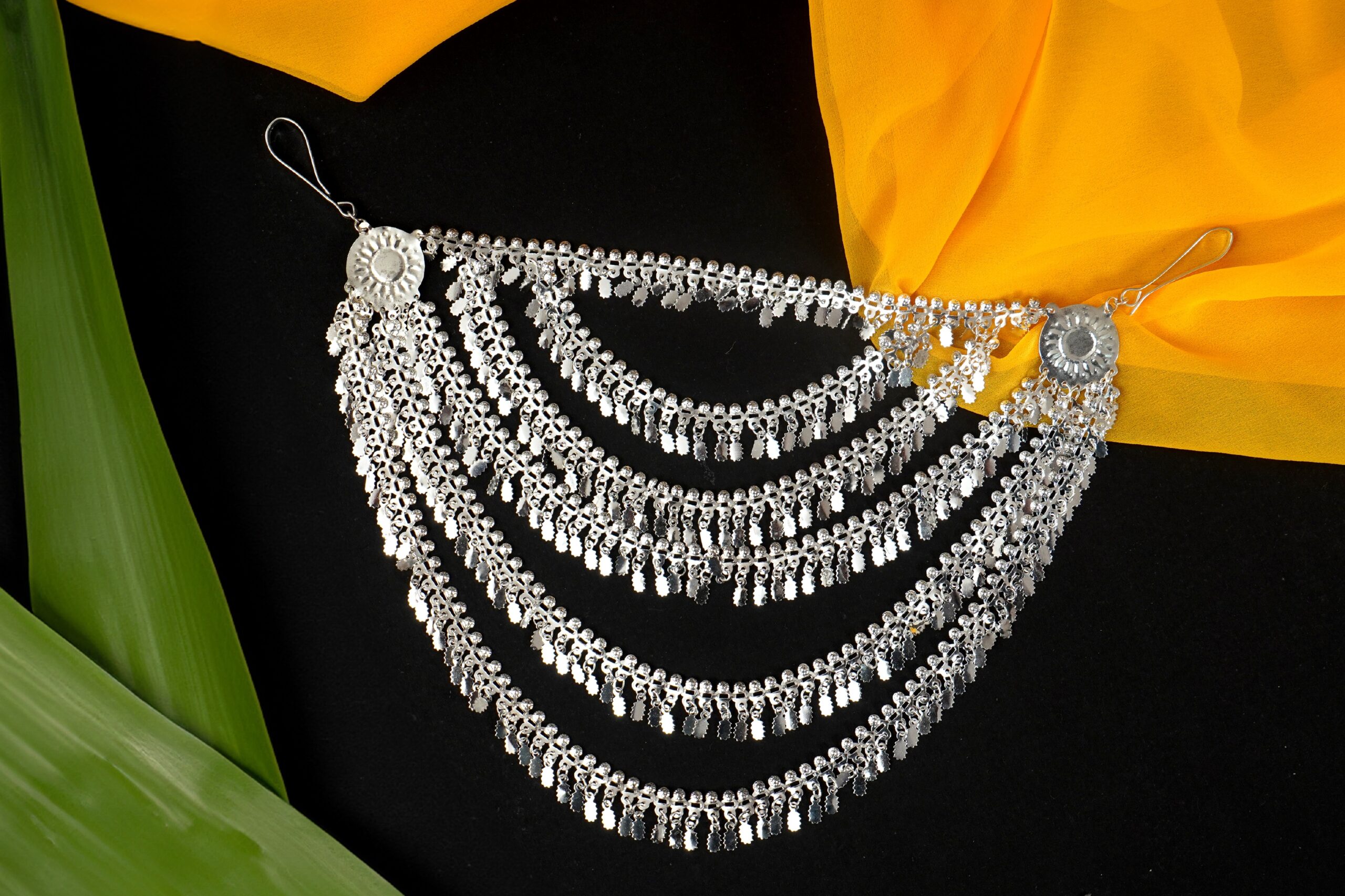 Women’s five-layer fashionable silver kamarbandhs are a striking and elegant piece that blends classic charm with contemporary style. This elaborate item, which accentuates the waistline and goes well with a range of ensembles, has several layers of tiny silver chains. Women who value both classic and modern jewelry designs will love the visually dynamic impact created by the five-layer design.