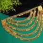offers a modern yet classic feel with its centerpiece design and layers of gold chains.