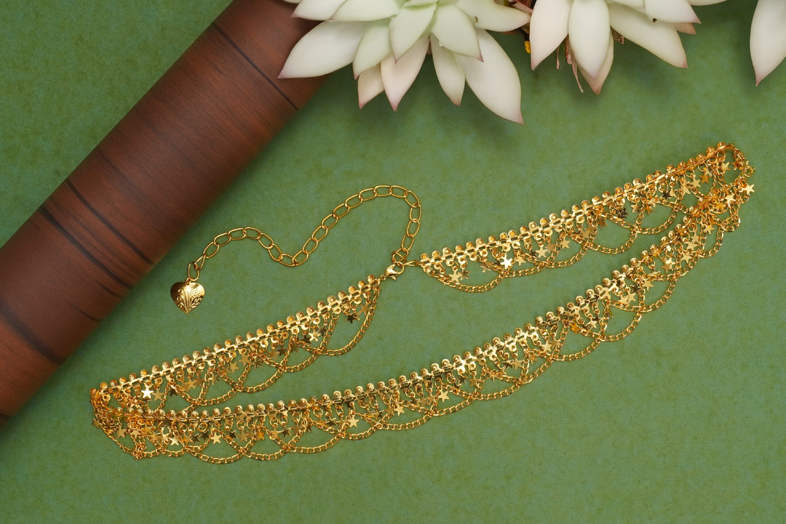 Layered Chains: To lend a layered, refined touch, some designs use layers of delicate gold chains embellished with tiny star pendants.