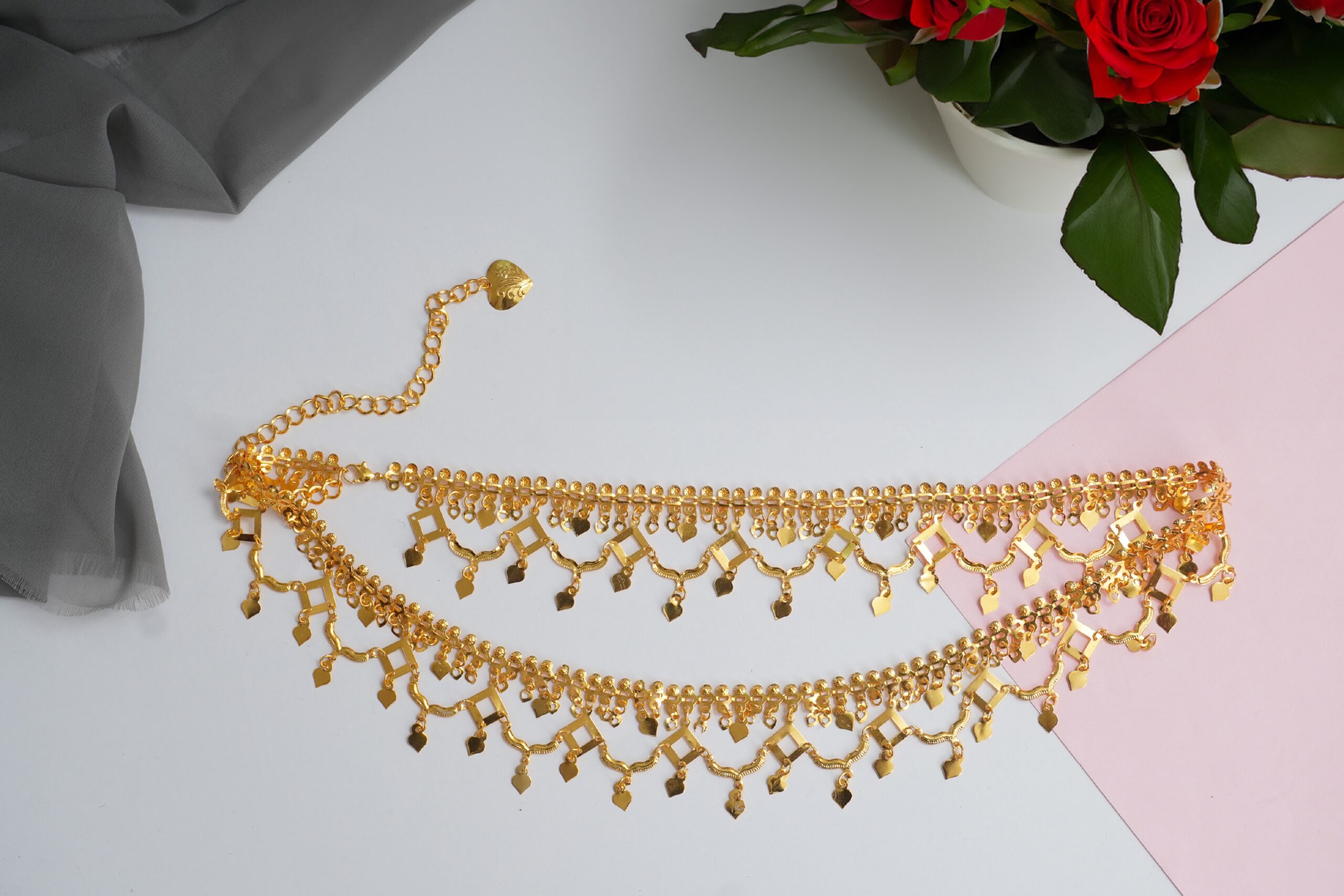 The bottom edge is frequently adorned with tiny dangling charms, beads, or bells (ghungroos), which provide style and a rhythmic sound.